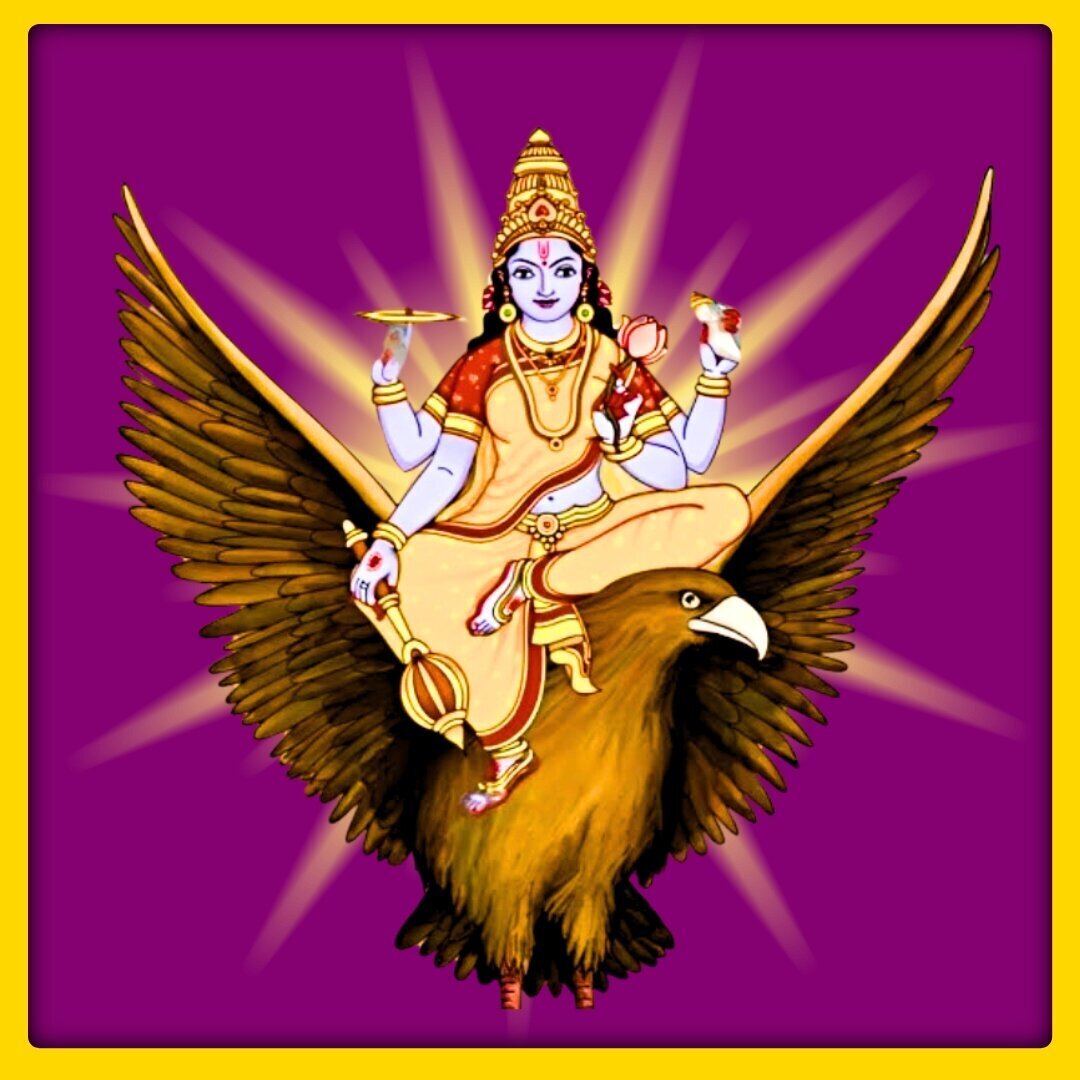 Goddess Vaishnavi is frequently represented bearing traits comparable to Lord Vishnu, such as a chakra (discus), shankha (conch), gada (mace), and padma (lotus), which represent her protective, nursing, and sustaining abilities. Her chariot, the Garuda (eagle), represents speed, strength, and clarity of vision, reinforcing her duty as a protector and preserver of Dharma.