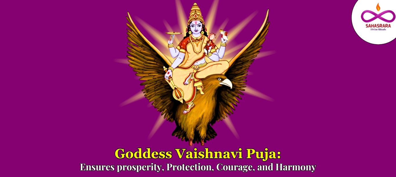 Goddess Vaishnavi Puja is a highly sacred rite honouring Goddess Vaishnavi, one of Hinduism's Eight celestial mother goddesses (Ashta Matrika). Goddess Vaishnavi is the Shakti (power) of Lord Vishnu, representing his virtues of preservation, protection, and cosmic order. She represents divine wisdom, riches, courage, and righteousness, therefore her worship is perfect for individuals seeking prosperity, harmony, and spiritual advancement.