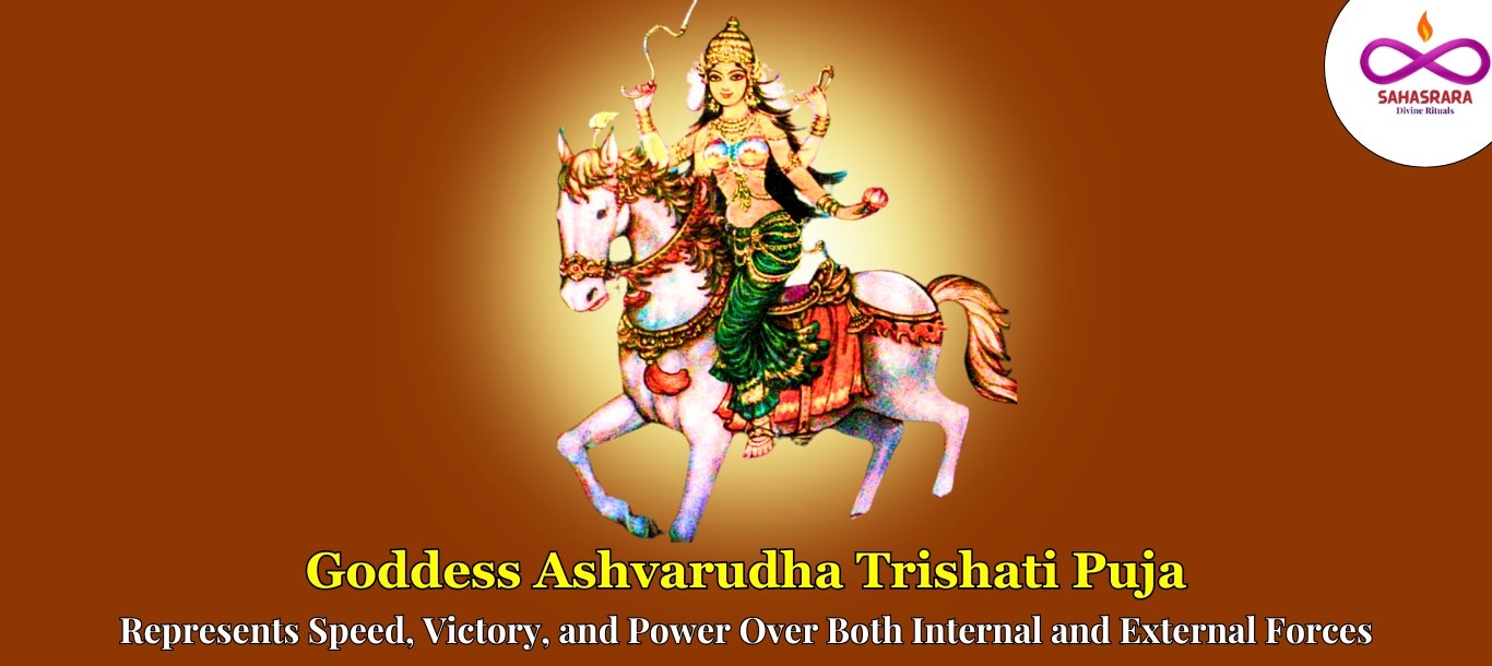 Goddess Ashvarudha Trishati Puja is a sacred rite honoring Goddess Ashvarudha, a powerful form of the Divine Mother in Hinduism. Ashvarudha means "one who rides a horse," and she is frequently represented atop a horse, representing speed, victory, and control over both inner and exterior forces. Ashvarudha is regarded for her capacity to help devotees overcome hurdles quickly and decisively, particularly in areas of personal development, worldly achievement, and spiritual upliftment. During the Trishati Puja, 300 sacred names of Goddess Ashvarudha are chanted, each reflecting a different facet of her heavenly characteristics and might.
